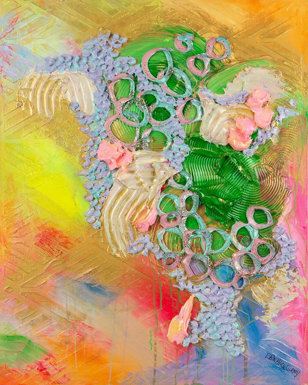 My art is a reflection of how I see the world: Full of hope, joy, laughter and in technicolor. My art flows from me intuitively, with each piece playfully taking shape as I go. I’m not afraid to incorporate unusual painting techniques to fully capture the feeling I’m placing on canvas.